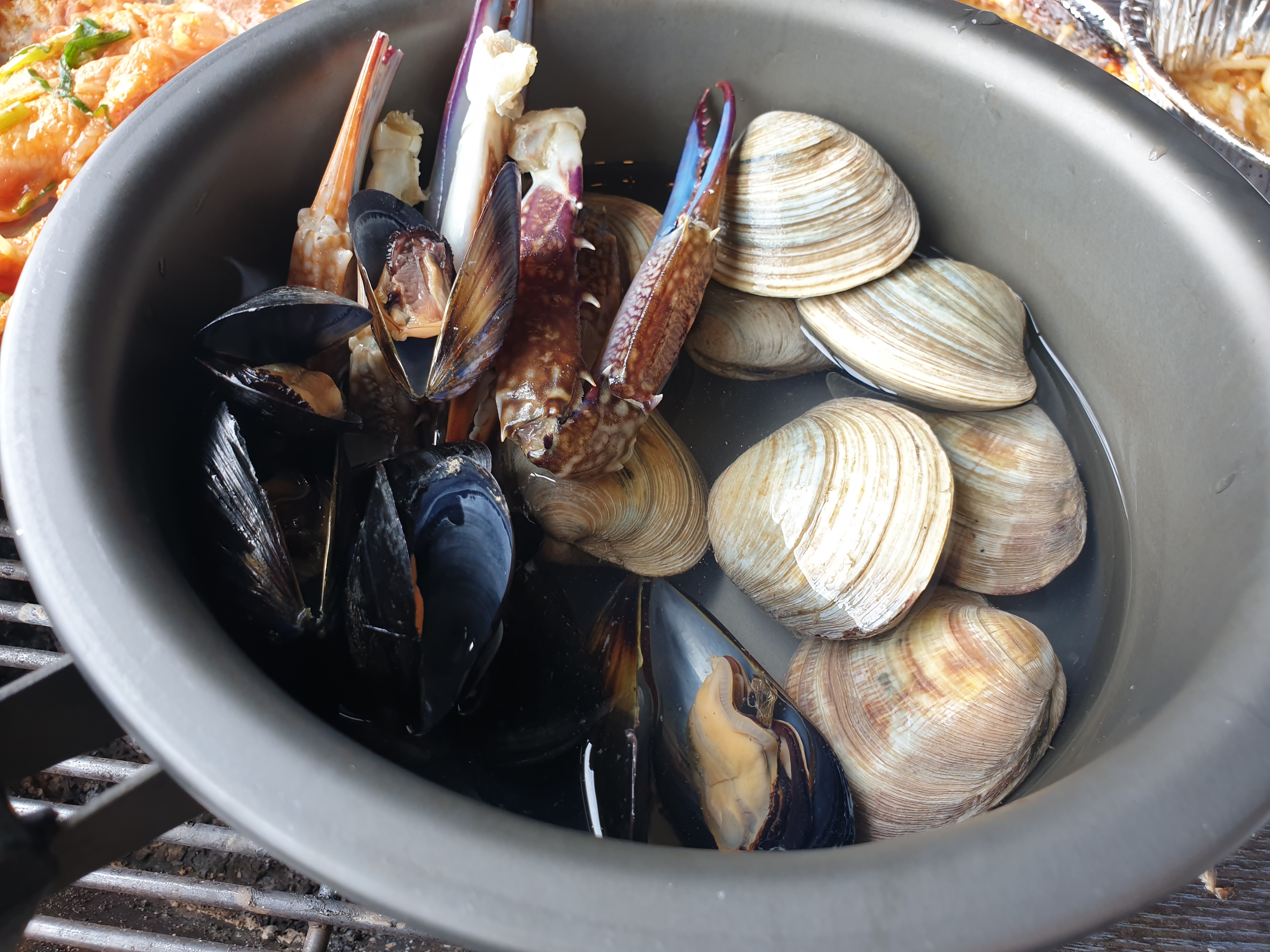 라면 셀프바 가면 홍합과, 꽃게, 고추, 라면 있습니다