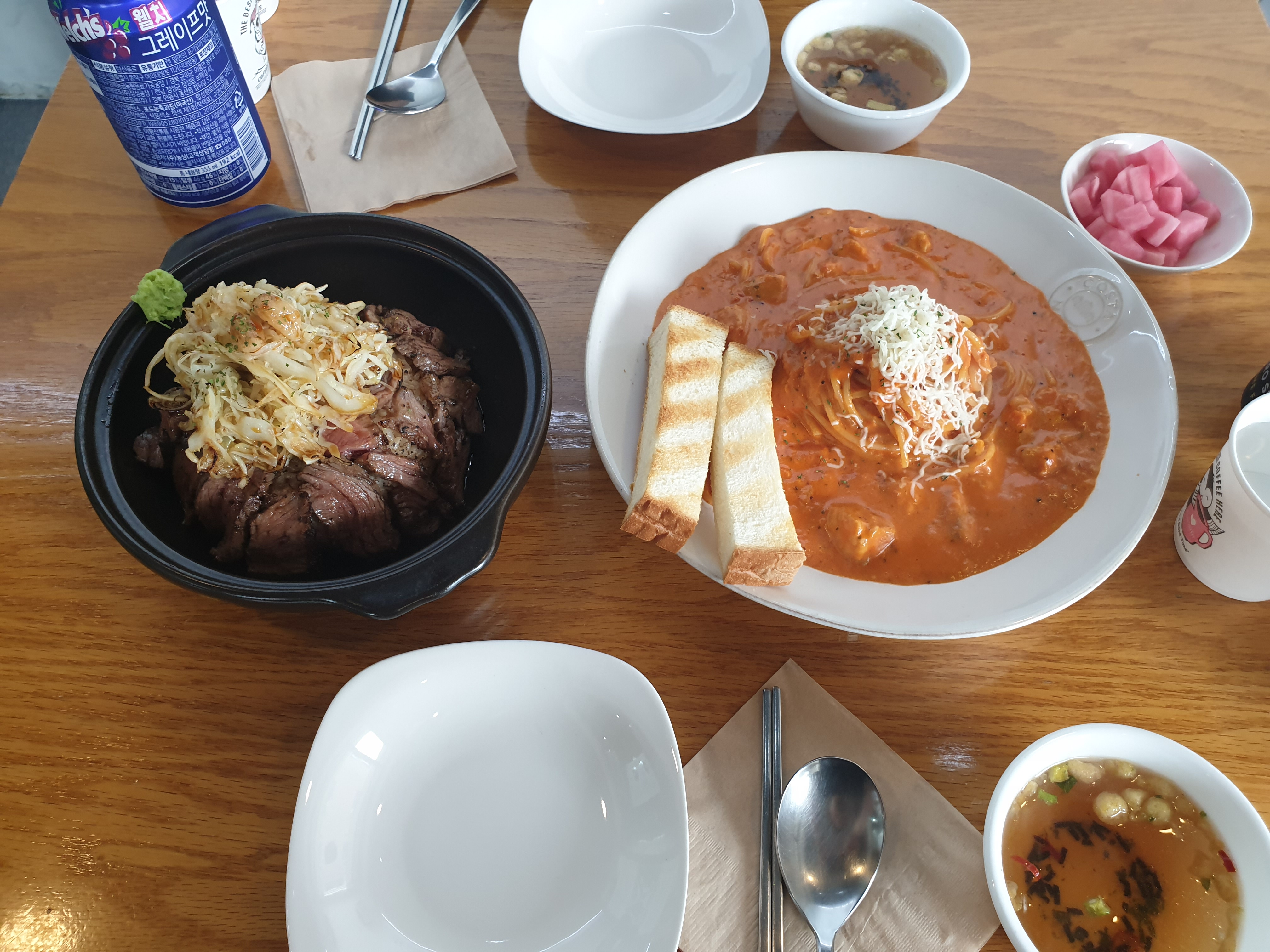 등심 스테이크 덮밥, 파스타, 탄산 2잔 주문합니다