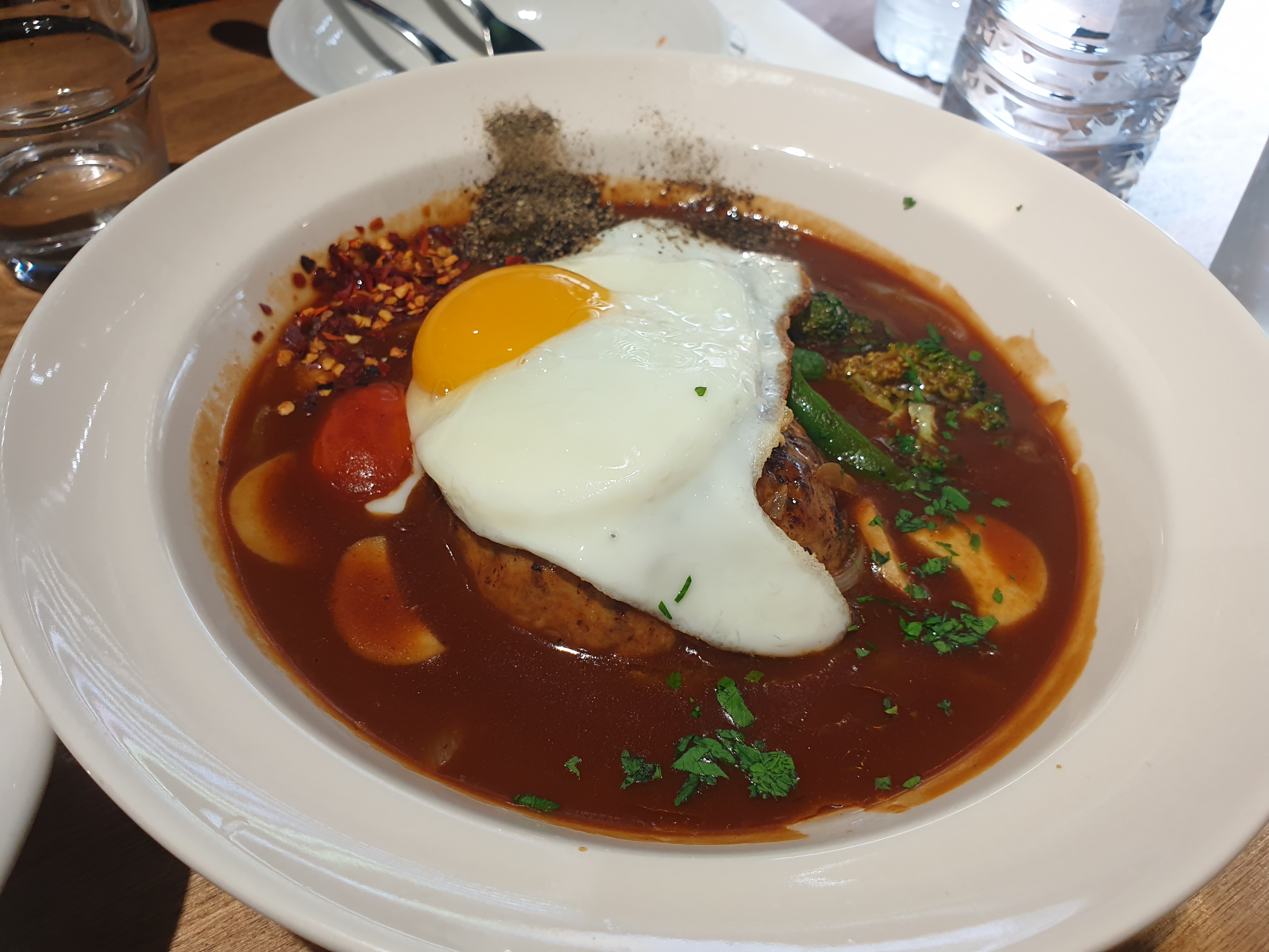 함박스테이크는 데미그라스 소스에 고추씨와 후추로